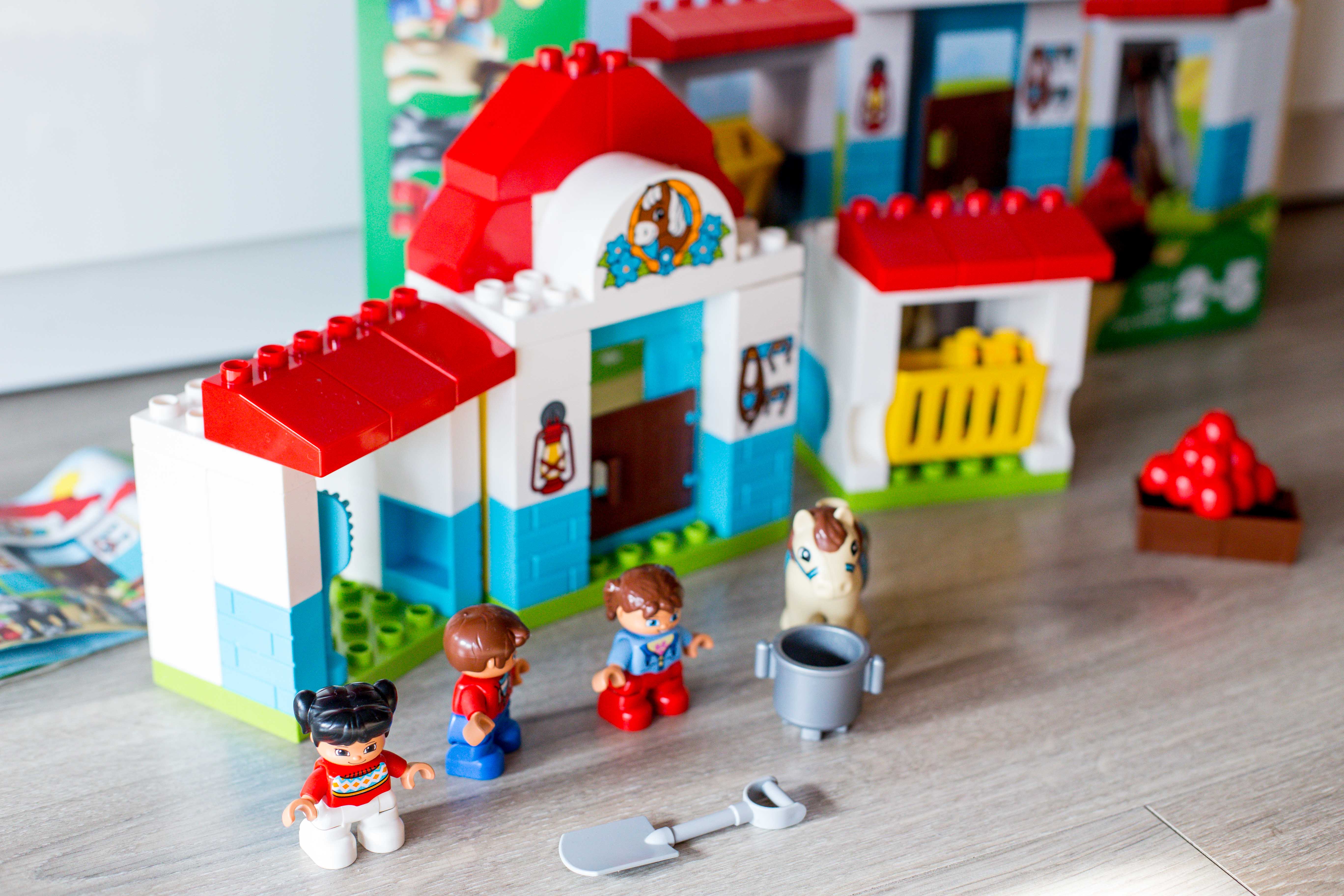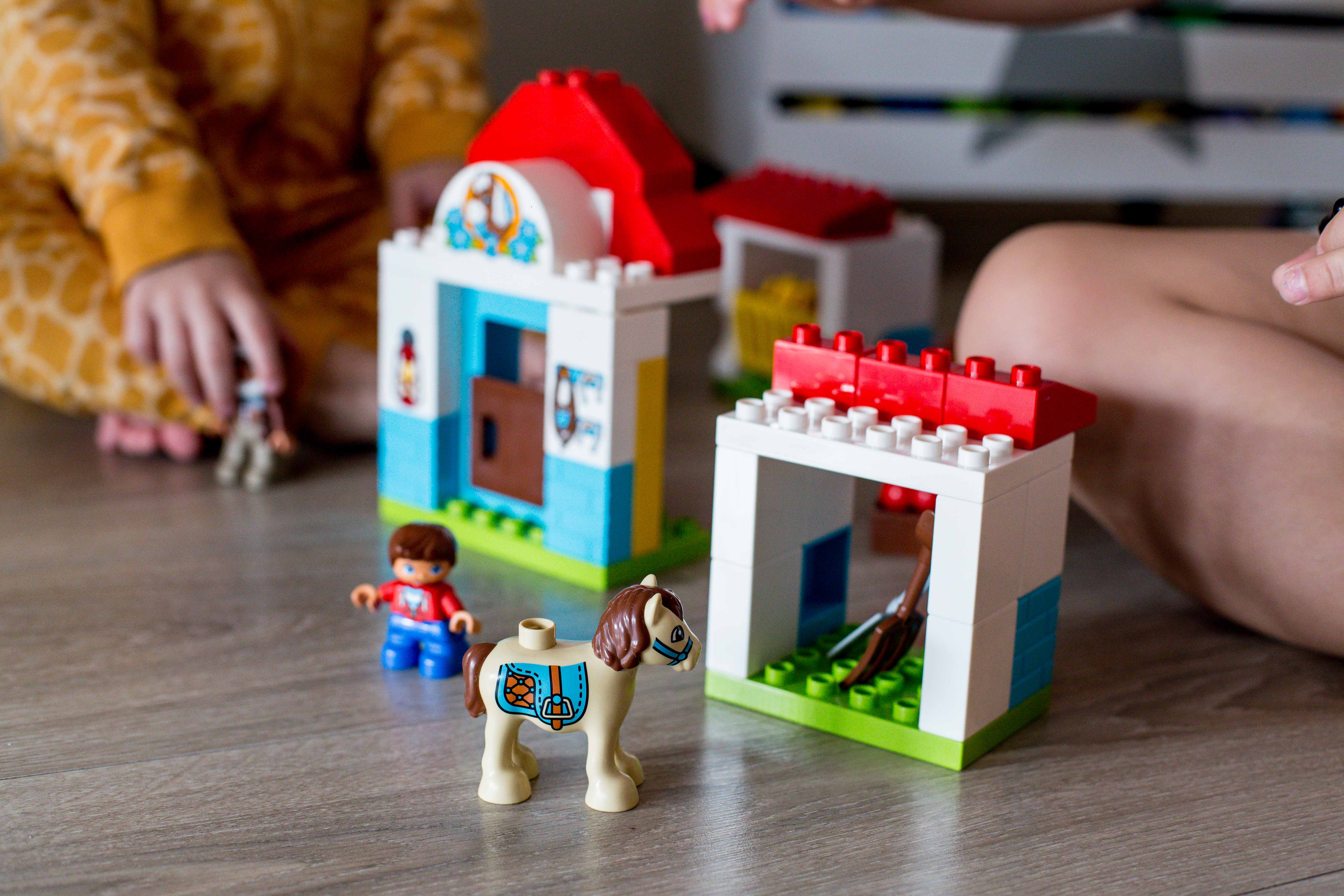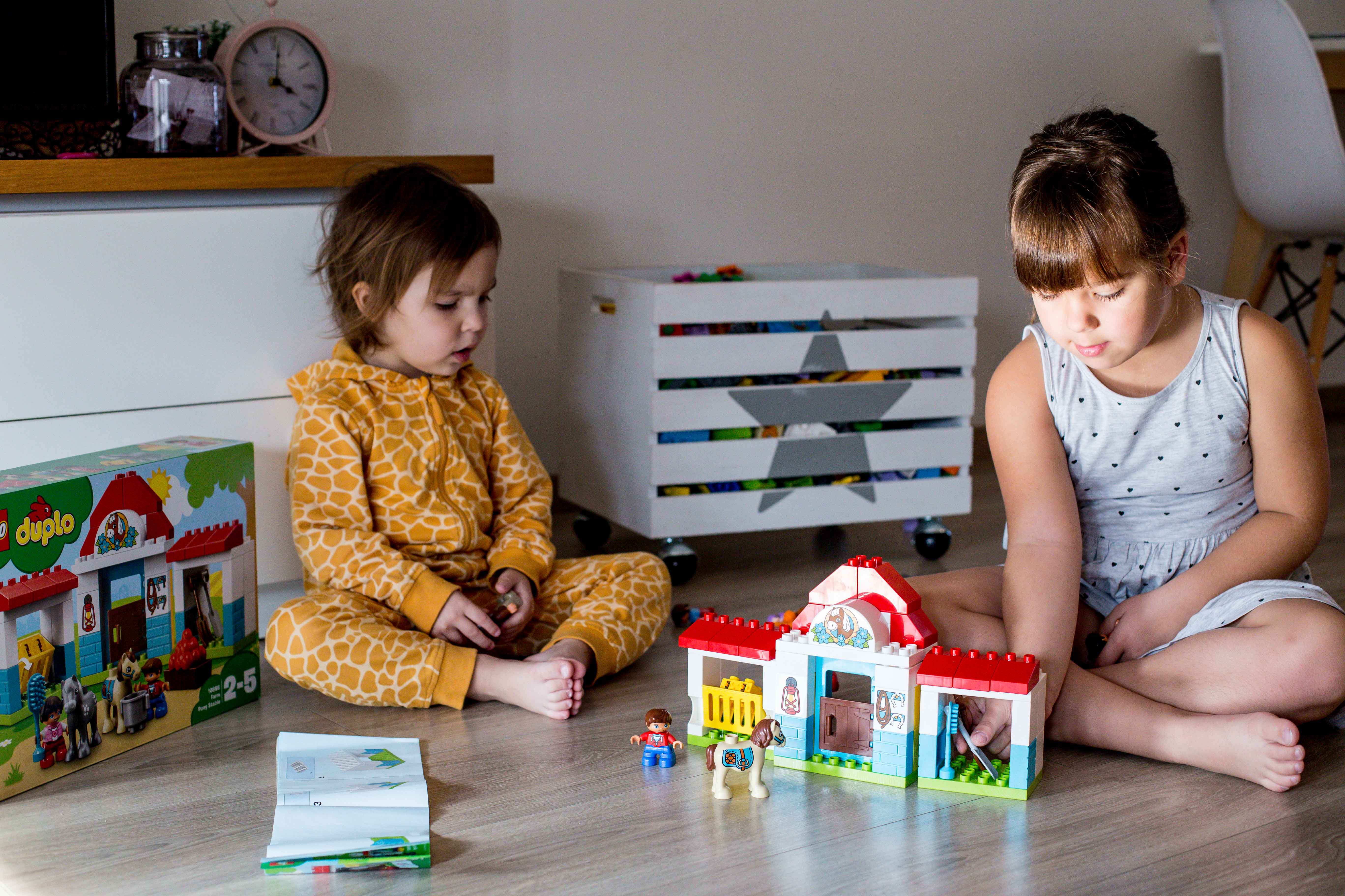 Najprostszą zabawą jest kupno nowego zestawu LEGO, który zawsze będzie cieszył. Wiadomo. Naszym nowym nabytkiem jest Stajnia z Kucykami LEGO DUPLO. Zbudowanie stajni jest bardzo proste i 3 – letnia Majka fantastycznie radzi sobie samodzielnie. Instrukcja, jak zawsze jest przejrzysta, więc bez problemu możesz zlecić dziecku zabawę „zrób to sam”. Zakup stajni był podyktowany tym, że Wiktoria będące na etapie odkrywania swoich pasji, coraz częściej mówi o tym, że chciałaby systematycznie jeździć konną. Dzwoniłam już do stadniny w okolicach Opola i dowiedziałyśmy się, że Wiki może rozpocząć naukę. Swoje zainteresowania przenosi na Majkę i sama widzisz, że nie było innej opcji jak sprezentować im właśnie stajnię LEGO. Co to za frajda! Co wchodzi w skład naszego zestawu? Figurki LEGO DUPLO oraz dwa kucyki. Zabawa w opiekowanie się kucykami, czesanie ich szczotką, karmienie sianem z paśnika i pojenie wodą z wiaderka, szczególnie podoba się Majce, bo Wiki wolałaby robić to w realu. Lecz co się odwlecze, to nie uciecze, więc dziewczynki chętnie bawią się wspólnie, mając z tego mnóstwo radości połączonej z doskonaleniem umiejętności społecznych, motorycznych i poznawczych.