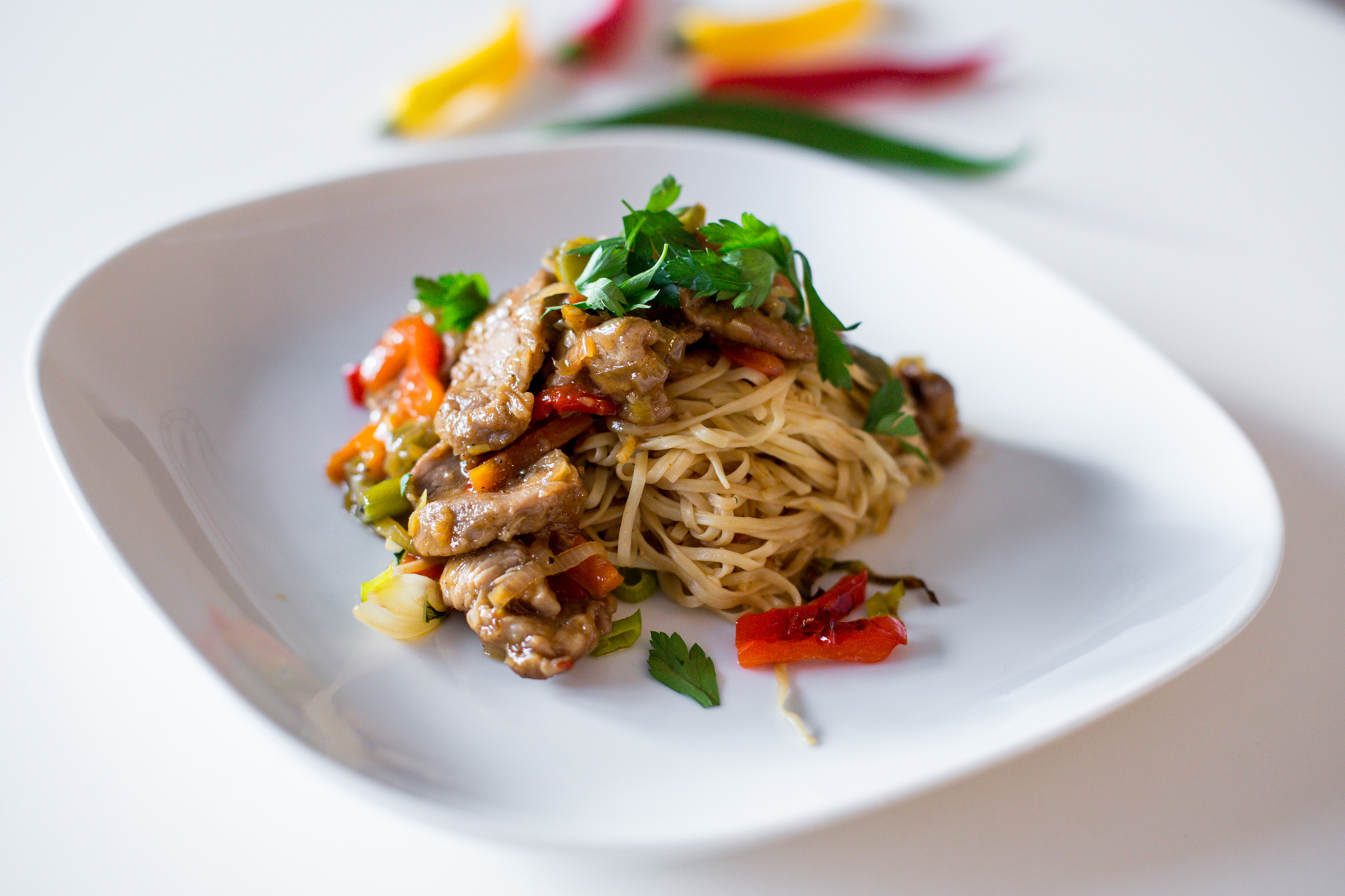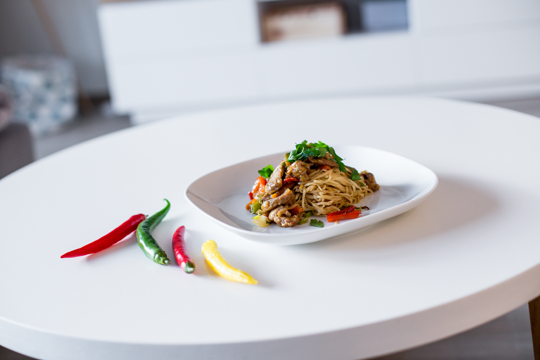 Podajemy z makaronem typu Chow Mein lub z ryżem. Ja makaron przesmażyłam na patelni z dodatkiem czosnku, imbiru i sosu sojowego.