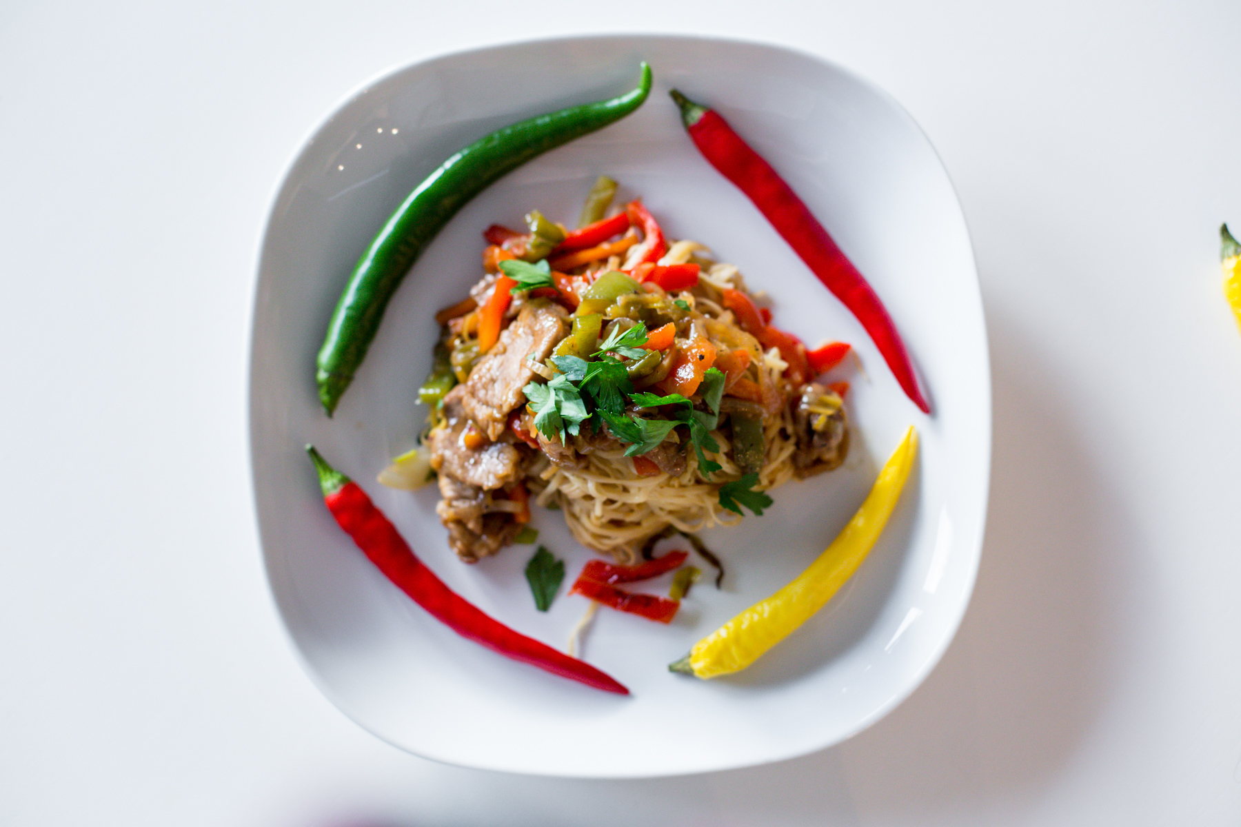 Podajemy z makaronem typu Chow Mein lub z ryżem. Ja makaron przesmażyłam na patelni z dodatkiem czosnku, imbiru i sosu sojowego.