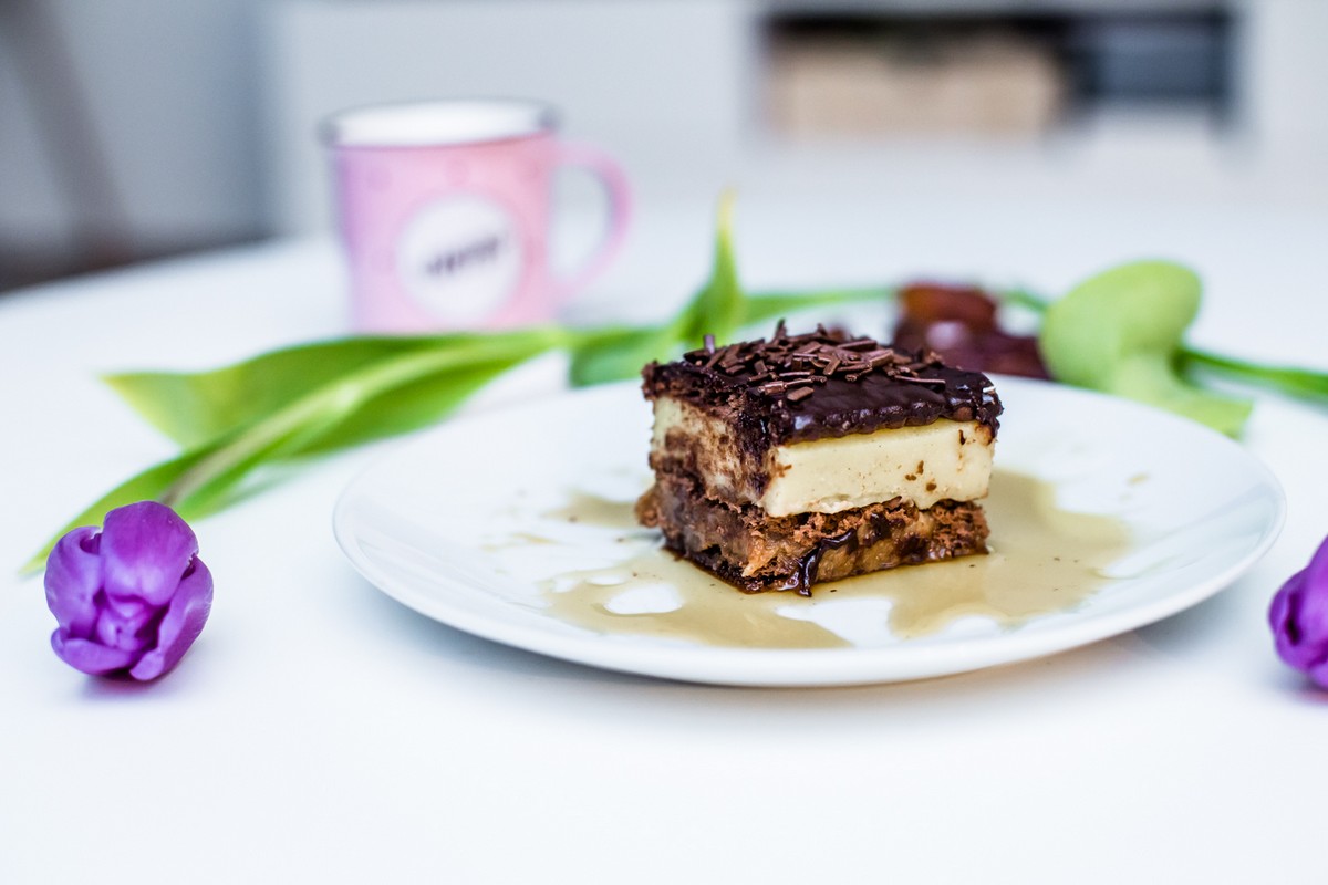 Ten przepis powstał tydzień temu u mojej siostry, kiedy miałyśmy ochotę na małe co nieco. Na szybko i zdrowo. Czyli tak, jak lubimy najbardziej. Minimum pracy, maximum przyjemności. Ona znała przepis na budyń, ja zaś na masę „kajmakową” bez nabiału i cukru, czyli tą w wersji wege. Poleciałam szybko do sklepu po herbatniki i za pół godziny próbowaliśmy nasz specjał. Wczoraj powtórzyłam przepis i nie byłabym sobą, gdybym nie podzieliła się z Tobą tym cudem. Będziecie wniebowzięci. To ciasto posmakuje każdemu bez wyjątku, a gdy zaserwujesz je gościom oniemieją z wrażenia.