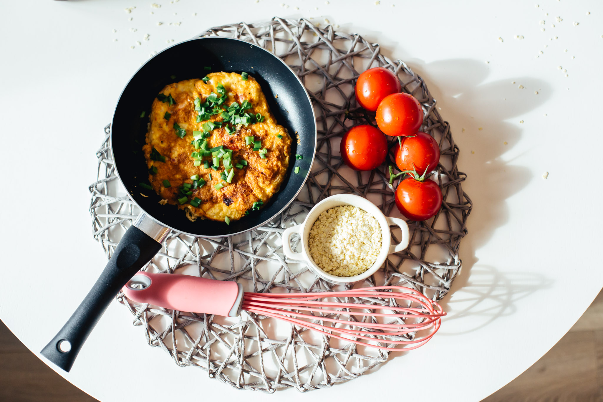 Jestem ciekawa jakie lubisz najbardziej? My lubimy różne: żytnie, kukurydziane. Ja bardzo lubię owsiane; owsianka z bananami i rodzynkami jest niezastąpiona podczas śniadań w sobotę. Natomiast dziewczynki lubią płatki kukurydziane a także płatki jaglane, które są bardzo szybką formą podania dziecku cennych zbóż. Kto lubi gotować kaszę jaglaną wie, że trochę się trzeba namęczyć, by wyszła pyszna i pozbawiona goryczki, co nie zawsze mi się udaje. Płatki jaglane są produkowane z rozgniecionych ziaren prosa i choć nie mają charakterystycznego smaku kaszy jaglanej, to nie są pozbawione składników odżywczych. A wręcz przeciwnie. Ponadto są cennym źródłem witaminy E, wapnia, potasu, fosforu i magnezu. Są świetną alternatywą dla śniadaniowych kanapek, a fakt, że można podawać je zarówno na ciepło jak i na zimno, dodatkowo przemawia za tym, by mieć je zawsze pod ręką. Dla dzieci połączenie płatków jaglanych z białkiem i warzywami lub owocami, stanowi idealny posiłek w sam raz na jesienny ranek. Dlatego moim dziewczynkom lubię zaserwować rano wytrawny omlet z płatkami jaglanymi i dodatkami. Ten omlet jest tak dobry, że chętnie zajada się nim cała nasza rodzina. Musisz go koniecznie spróbować, dlatego zapisz sobie przepis i wracaj do niego ilekroć będziesz mieć smaka na szybkie i wartościowe śniadanie.