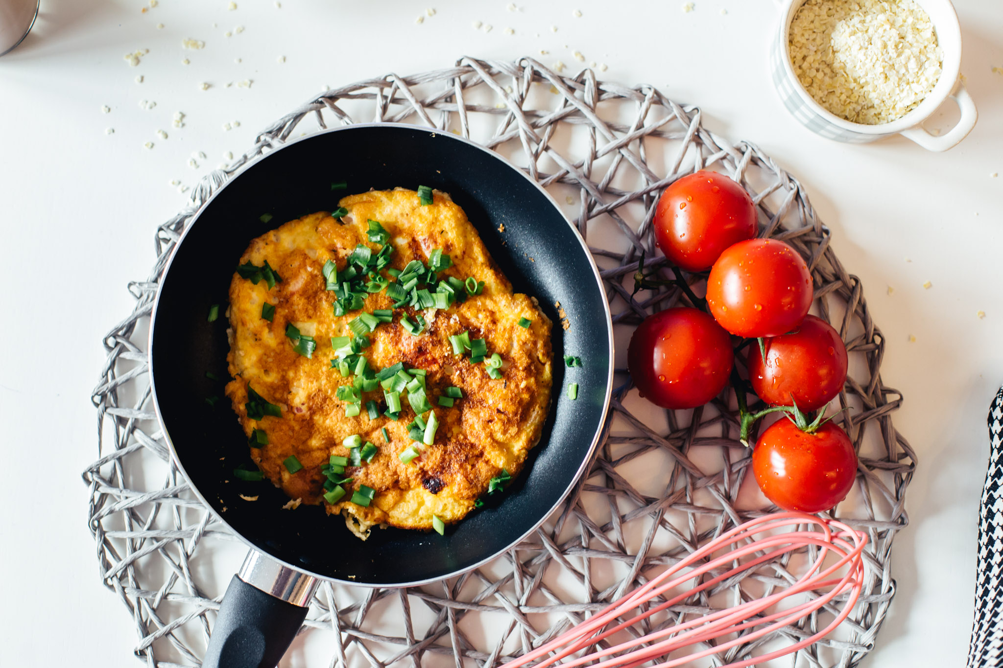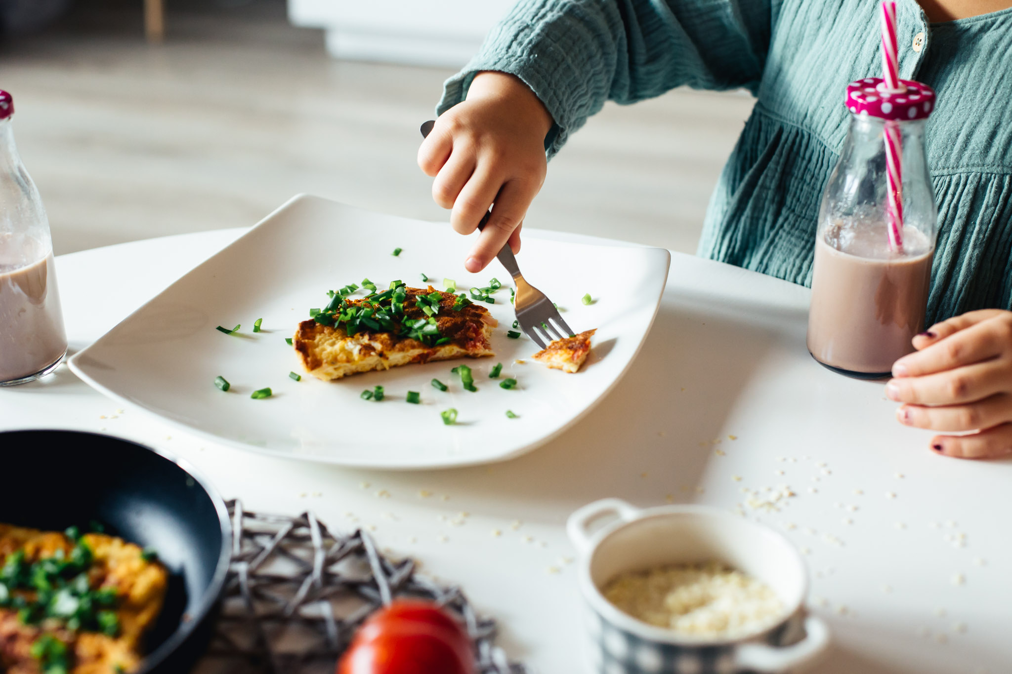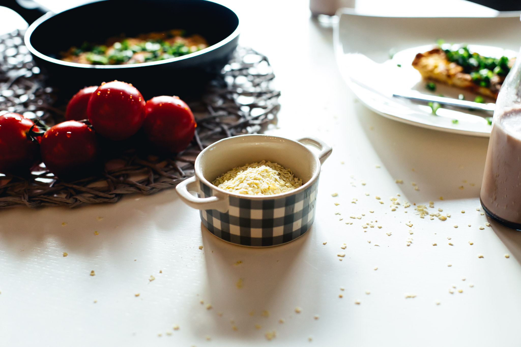 Jestem ciekawa jakie lubisz najbardziej? My lubimy różne: żytnie, kukurydziane. Ja bardzo lubię owsiane; owsianka z bananami i rodzynkami jest niezastąpiona podczas śniadań w sobotę. Natomiast dziewczynki lubią płatki kukurydziane a także płatki jaglane, które są bardzo szybką formą podania dziecku cennych zbóż. Kto lubi gotować kaszę jaglaną wie, że trochę się trzeba namęczyć, by wyszła pyszna i pozbawiona goryczki, co nie zawsze mi się udaje. Płatki jaglane są produkowane z rozgniecionych ziaren prosa i choć nie mają charakterystycznego smaku kaszy jaglanej, to nie są pozbawione składników odżywczych. A wręcz przeciwnie. Ponadto są cennym źródłem witaminy E, wapnia, potasu, fosforu i magnezu. Są świetną alternatywą dla śniadaniowych kanapek, a fakt, że można podawać je zarówno na ciepło jak i na zimno, dodatkowo przemawia za tym, by mieć je zawsze pod ręką. Dla dzieci połączenie płatków jaglanych z białkiem i warzywami lub owocami, stanowi idealny posiłek w sam raz na jesienny ranek. Dlatego moim dziewczynkom lubię zaserwować rano wytrawny omlet z płatkami jaglanymi i dodatkami. Ten omlet jest tak dobry, że chętnie zajada się nim cała nasza rodzina. Musisz go koniecznie spróbować, dlatego zapisz sobie przepis i wracaj do niego ilekroć będziesz mieć smaka na szybkie i wartościowe śniadanie.