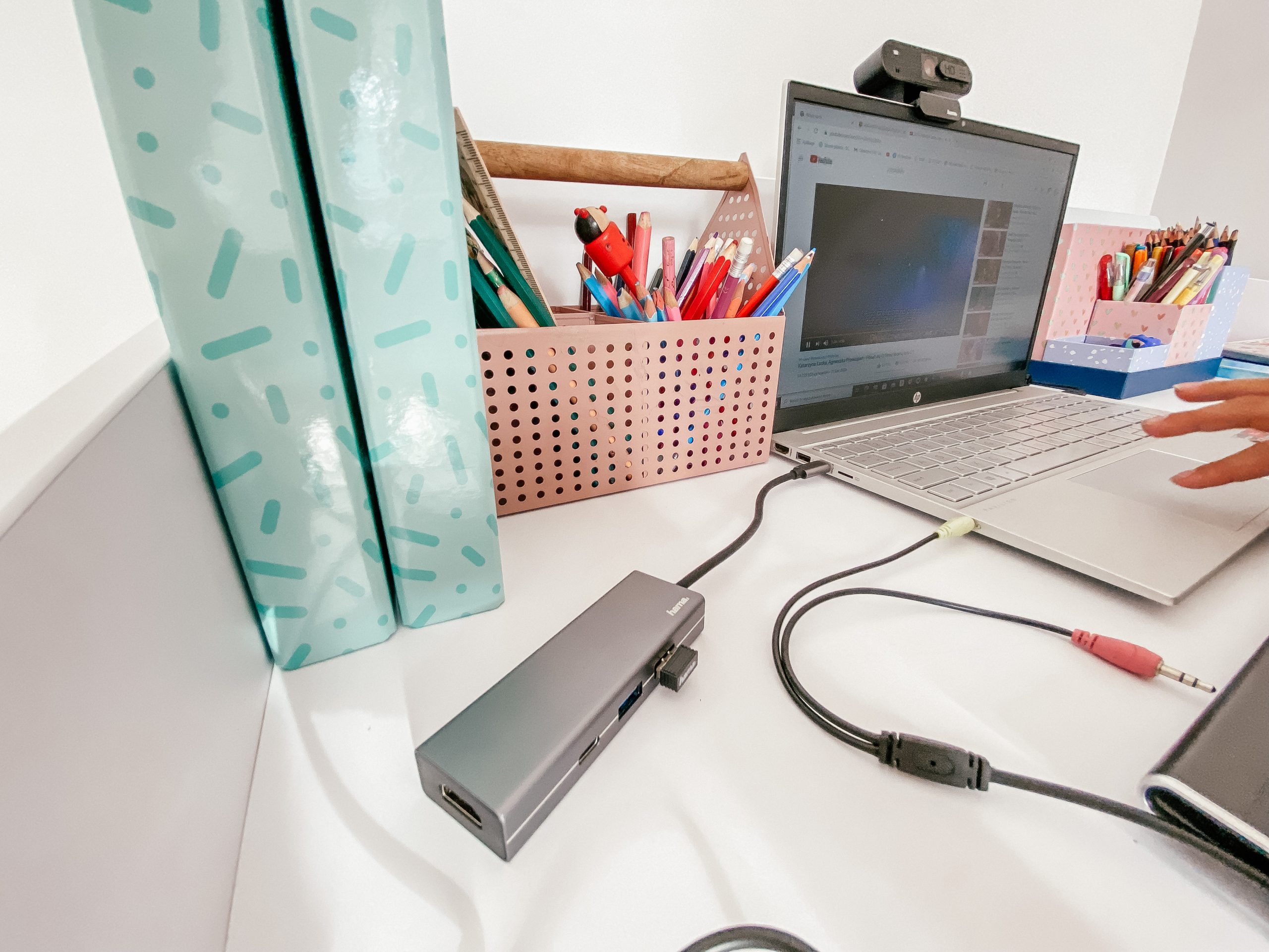 - Mamy jeszcze Multiport USB-C, który pomaga to wszystko podłączyć w sytuacji braku odpowiedniej liczby gniazd w komputerze. Żałuję, że wcześniej nie wiedziałam, że coś takiego istnieje! Marzę, że kiedy będę miała już swoje mieszkanie, będzie w nim kącik dla mojej pracy i wtedy taki zestaw o którym Wam wspomniałam, zostanie idealnym rozwiązaniem również dla mnie.