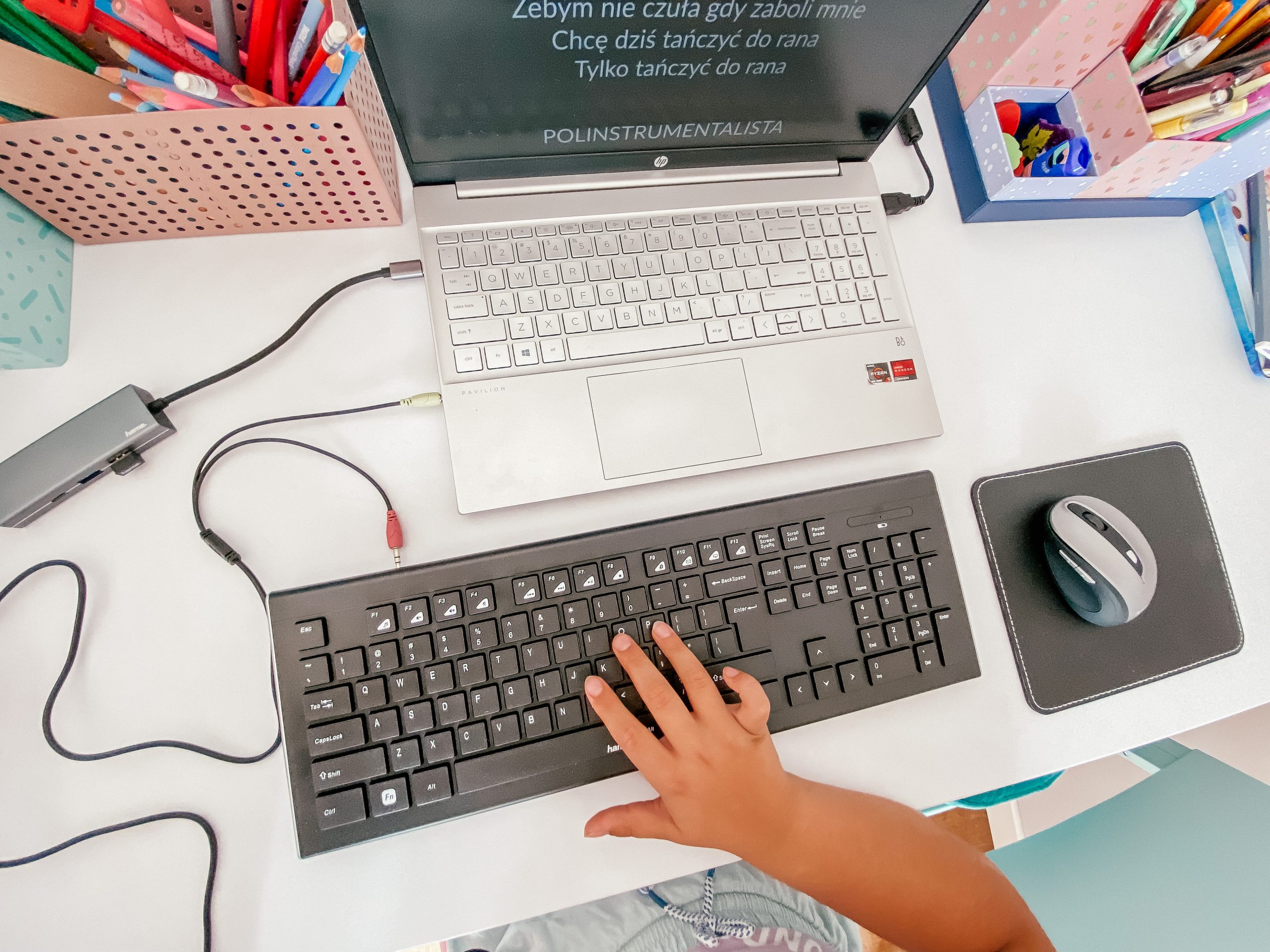 PRZYGOTOWANIE ZAPLECZA. Podczas zeszłego roku i w trakcie ostatniej nauki zdalnej totalnie nie byłyśmy do tego przygotowane. Wiki nie miała jeszcze biurka, więc wszystko rozgrywało się w salonie. Laptop co chwilę odmawiał posłuszeństwa – a to kamera się psuła, a to mikrofon…ogólnie wszystko było nie tak, jak być powinno. Teraz się przygotowaliśmy. Najpierw ogarnęłam biurko, żeby w ogóle Wiki miała komfort pracy (nawet odrabiając lekcje w swoim pokoju). A z pomocą marki HAMA – partnera tego wpisu – przygotowałam: kamerkę internetową C-600 Pro, dobre słuchawki multimedialne z mikrofonem HS-P200, klawiaturę bezprzewodową Cortino i myszkę MW-400 z solidną skórzaną podkładką , także z technologią radiową, bez kabla. Czyli zestaw, który jest niezbędny do tego, żeby nauka w domu była przyjemna i efektywna.