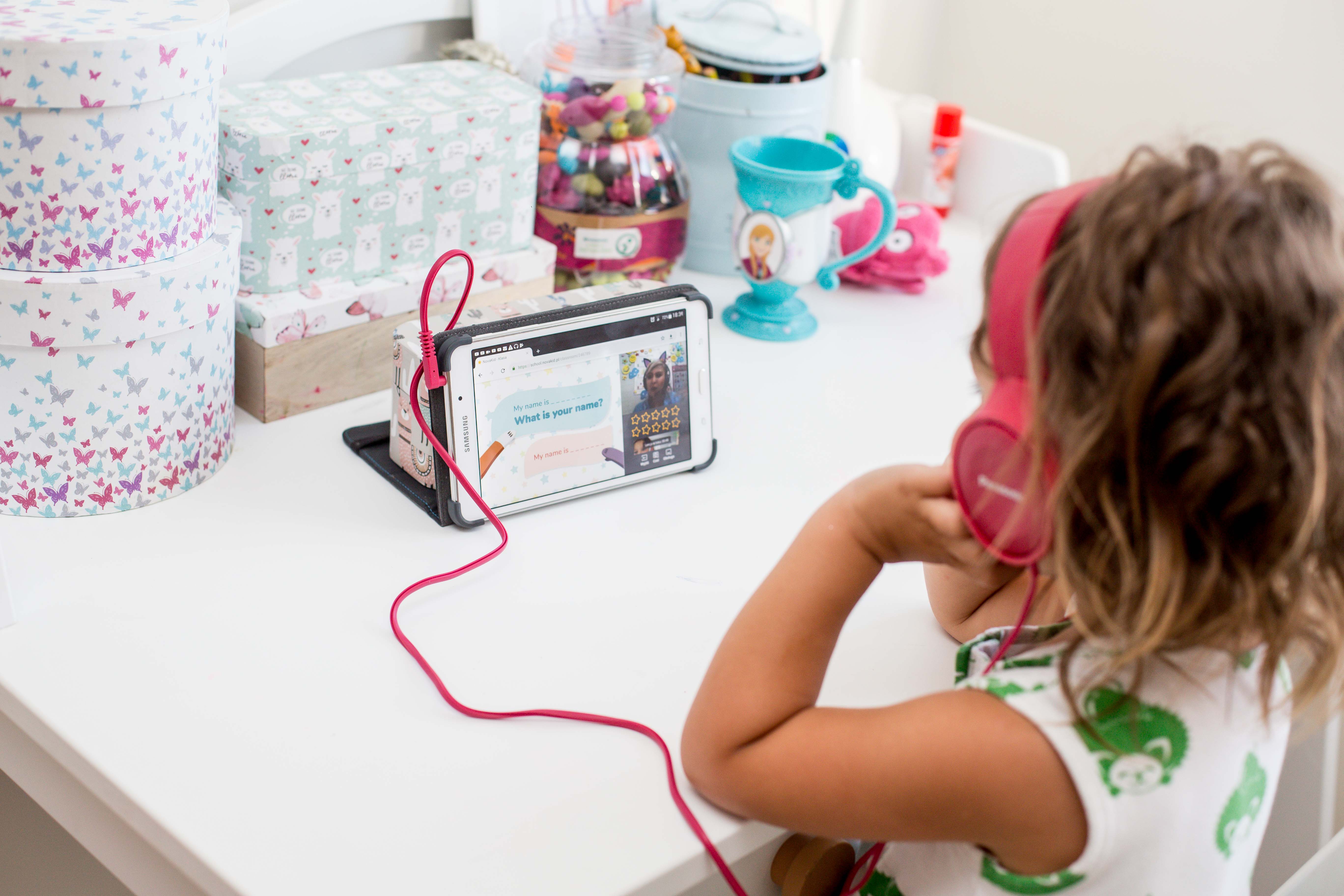 Szkoła językowa NOVAKID oferuje indywidualne lekcje w wirtualnej klasy z anglojęzycznym nauczycielem. Podczas lekcji, które odbywają się w domu (do nauki potrzebujesz komputer lub laptop z głośnikiem oraz kamerą), nauczyciele używają różnych metod dydaktycznych, takich jak chociażby pomoce wizualne oraz gry edukacyjne. Dziecko za dobrze wykonane zadanie jest nagradzane gwiazdką oraz przybiciem piątki. Te zdobywane gwiazdeczki podczas lekcji, szalenie motywują dziewczynki do robienia kolejnych, wyznaczanych im zadań.