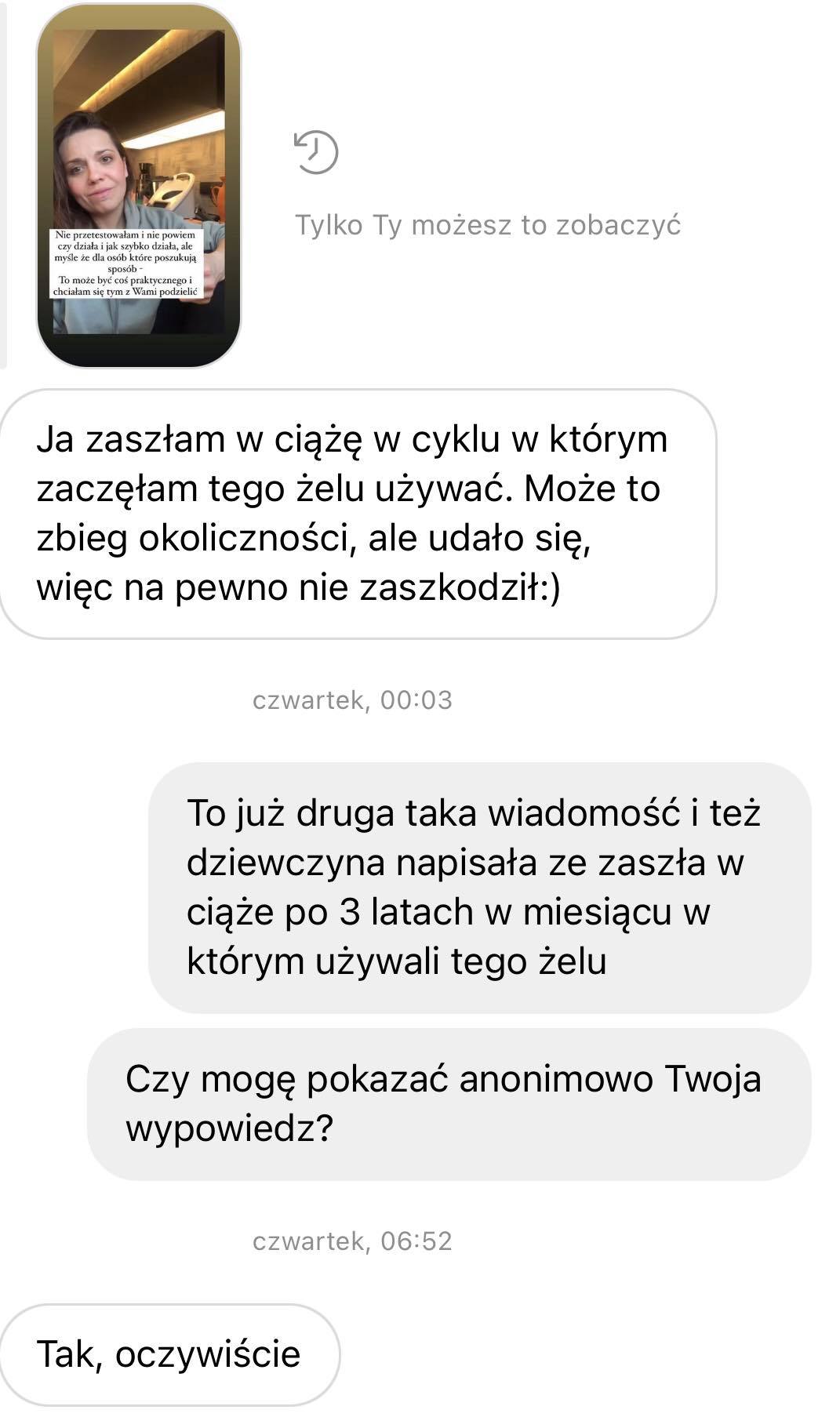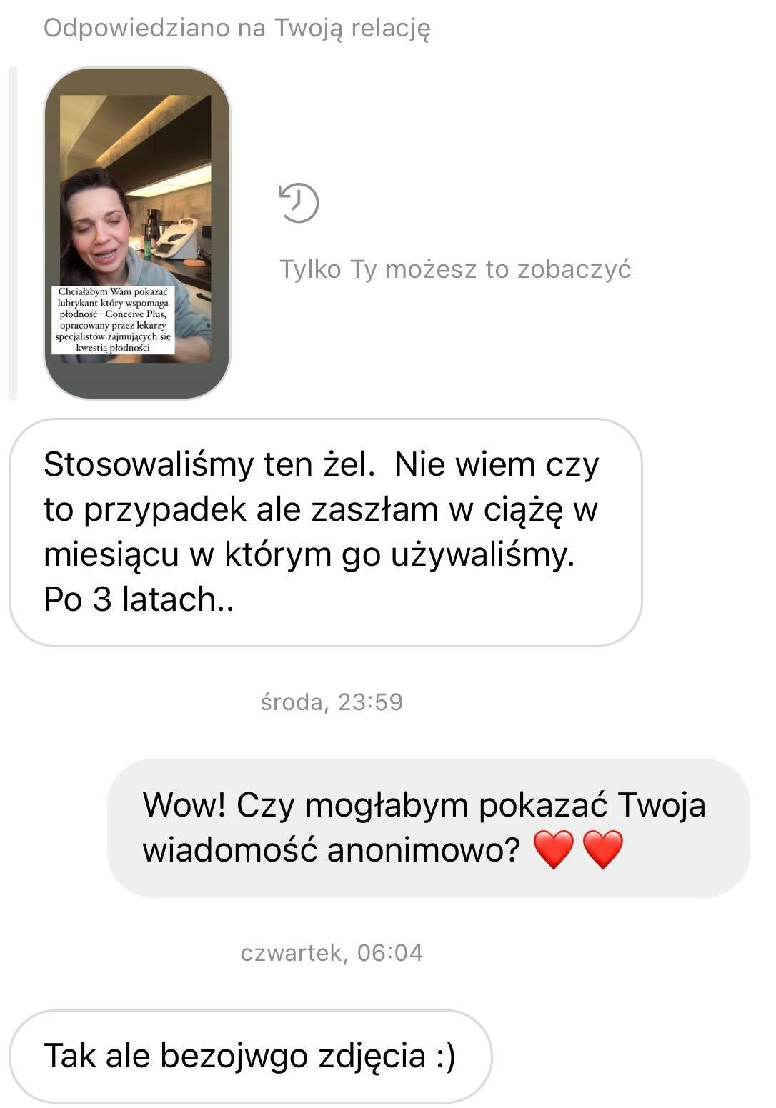 Tutaj mogę gdybać, ale my właśnie używaliśmy zwykłych lubrykantów i dopiero teraz wiem, że to mogło być przeszkodą. Chciałabym wtedy wiedzieć o tym, czym się teraz dzielę z Tobą…Poza tym Conceive Plus redukuje suchość pochwy – a to również ma znaczenie przy procesie zapłodnienia. Nie wspominając już o tym, że sam lubrykant ogólnie czyni współżycie przyjemniejszym. Przejrzałam opinie w internecie i ten produkt jest naprawdę świetny.Lubrykant Conceive Plus został opracowany przez lekarzy i specjalistów z dziedziny płodności i jest polecany przez wiele klinik zajmujących się tematem płodności kobiet. W okresie starań o dziecko on na pewno nie zaszkodzi. Co najwyżej może pomóc, co pokazują chociażby wiadomości, które dostałam, kiedy opowiadałam o tym produkcie na Instagramie. Same zobaczcie. Może i Ty masz jakieś doświadczenie? Napisz do mnie na priv, a anonimowo jeśli wyrazisz zgodę, podzielę się Twoją historią.