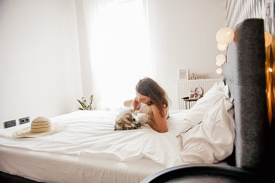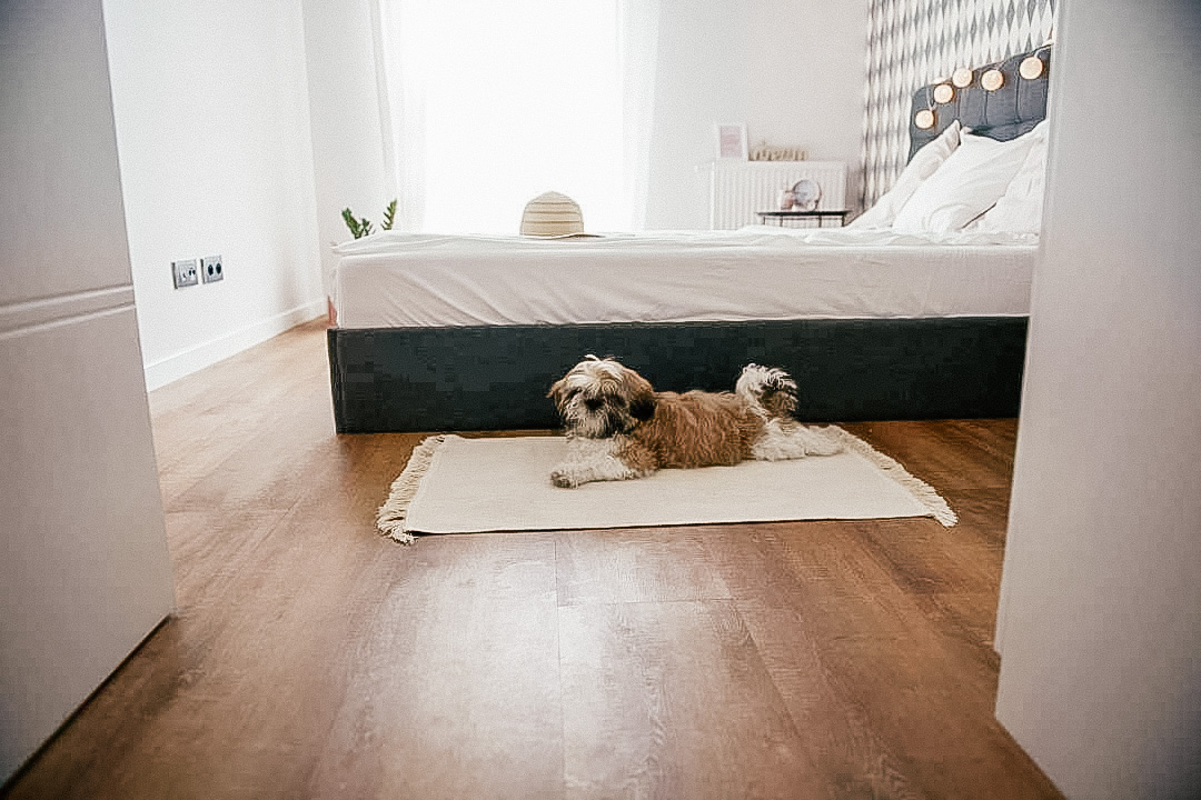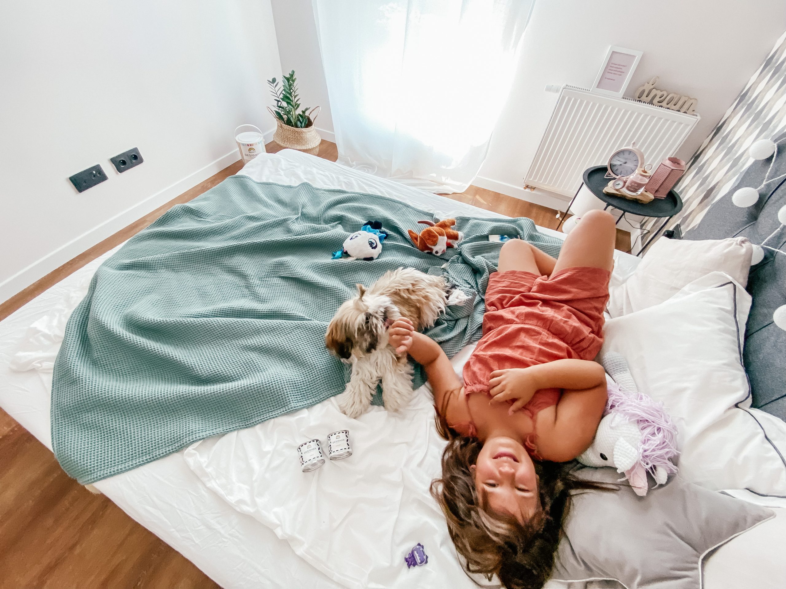 Bo tak właśnie wygląda nasze życie – mało jest w nim wyprasowanej pościeli, idealnie rozłożonej na łóżku, a już na pewno na tej białej pościeli nie ma porannej kawy i rogalików z dżemem! Nigdy nie jadłam śniadania w łóżku ubrana w białą, lnianą, zwiewną sukienkę. Nigdy też w takiej inscenizacji nie było małych, bosych stópek. Śmiem twierdzić, że jakbym nawet chciała uwiecznić taki kadr celowo… to skończyłoby się to jedną wielką katastrofą! Jak zatem jest u nas w domu? Są dzieciaki skaczące po łóżku, od 2 miesięcy pies szczekający w niebogłosy, kiedy nie chcesz go wpuścić na łóżko, gdy ganiają po nim dziewczynki… gdzieniegdzie porozrzucane pranie, rozłożona deska do prasowania i zabawki w kącie… to jest nasze życie! I choć czasem do zdjęć się posprząta, albo uprzątnie kawałeczek… to na co dzień… nasze cztery kąty wyglądają tak jak wasze…albo Wasze tak jak moje. W końcu to wnętrza są dla nas, a nie my dla wnętrz, prawda?