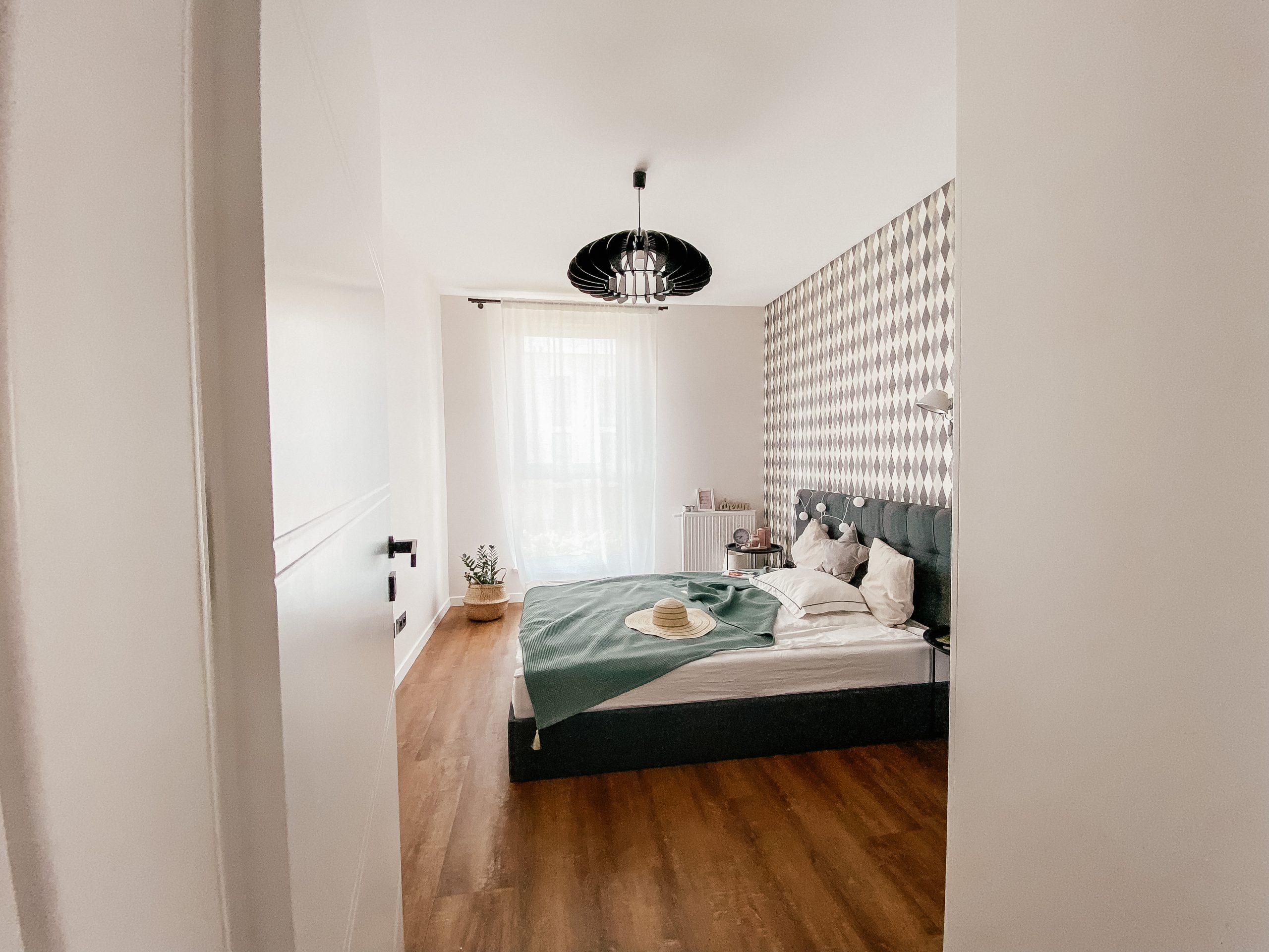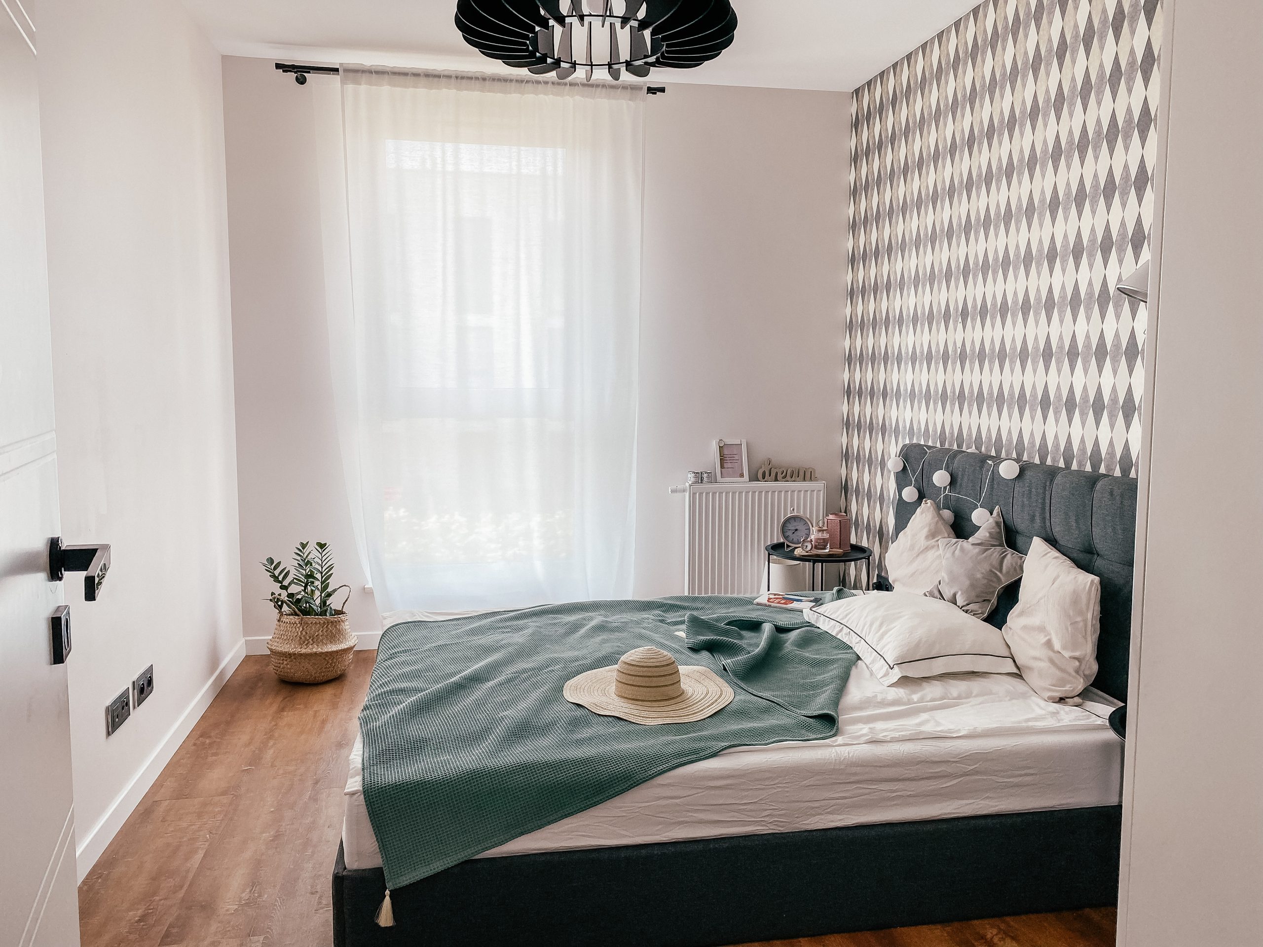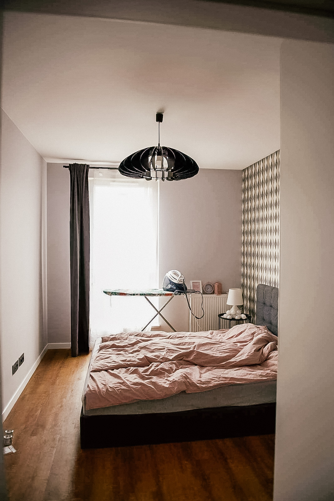 O przemalowaniu myślałam już dużo wcześniej, bo choć mieszkanie urządzone jest bardzo gustownie, widziałam oczami swojej wyobraźni w sypialni inny kolor niż szary. W połączeniu z winylowymi panelami imitującymi drewnianą podłogę, marzyłam o jasnych ścianach, które mogłyby nieco rozjaśnić wnętrze. Bo o ile zimą jakoś mi to nie przeszkadzało, o tyle latem… chciałam, żeby miejsce, w którym śpię i budzę się rano emanowało dobrym vibem. Jak to wyglądało przed metamorfozą? Oto moja sypialnia przed: