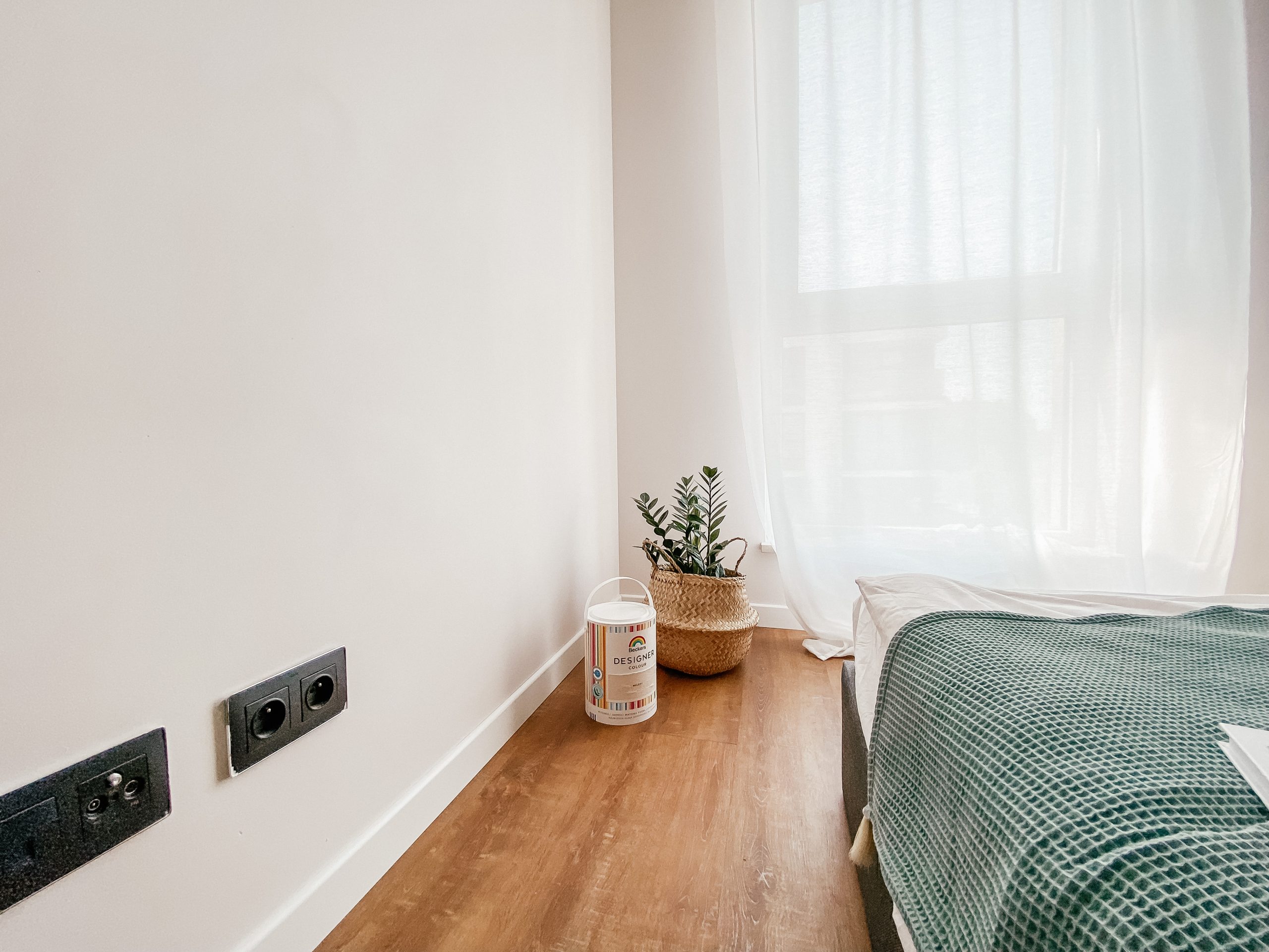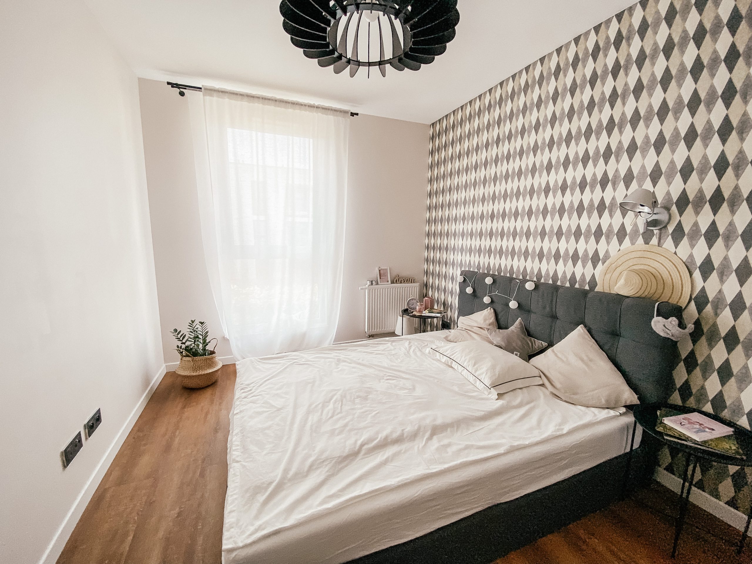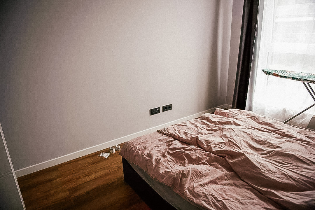 O przemalowaniu myślałam już dużo wcześniej, bo choć mieszkanie urządzone jest bardzo gustownie, widziałam oczami swojej wyobraźni w sypialni inny kolor niż szary. W połączeniu z winylowymi panelami imitującymi drewnianą podłogę, marzyłam o jasnych ścianach, które mogłyby nieco rozjaśnić wnętrze. Bo o ile zimą jakoś mi to nie przeszkadzało, o tyle latem… chciałam, żeby miejsce, w którym śpię i budzę się rano emanowało dobrym vibem. Jak to wyglądało przed metamorfozą? Oto moja sypialnia przed: