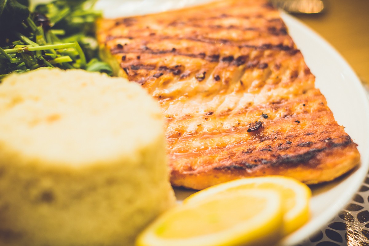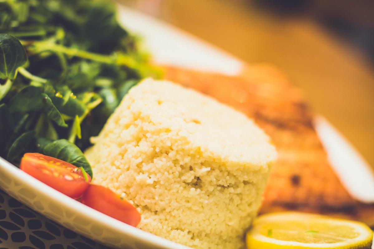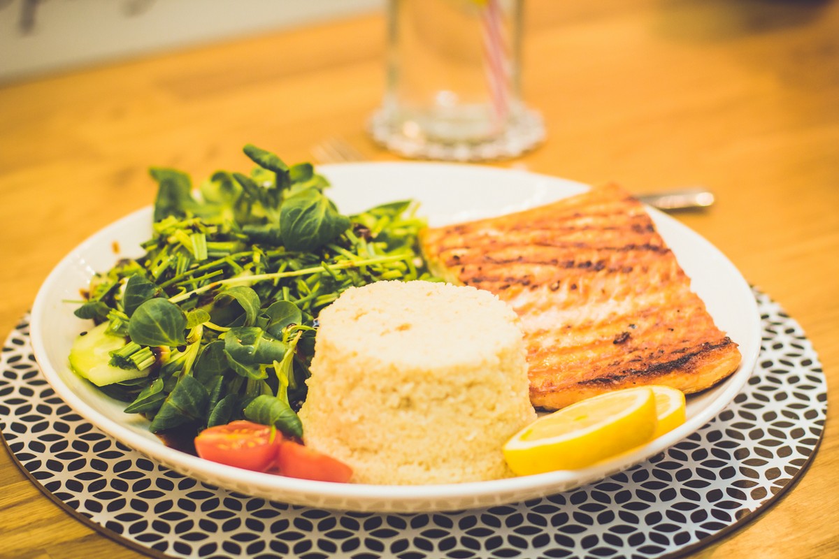 Łososia przyrządzam na patelni grillowej. Swojego czasu chciałam zakupić grill elektryczny, ale więcej z tym roboty, a w smaku – dla mnie to samo. Zazwyczaj usuwam skórę z fileta, bo dzięki temu szybciej łosoś dochodzi do siebie, i jest bardziej upieczony. Ale to tylko kwestia gustu. Czas grillowania to tylko 10 minut, w międzyczasie przyrządzam całą resztę. Kuskus zalewam wrzątkiem, a sałatka to rzecz tam banalna, że każdemu się uda. Uwielbiam połączenie sałaty, ogórka i kremu balsamicznego. Szczypiorek nadał jej wyrazistego charakteru.
